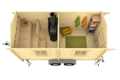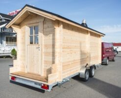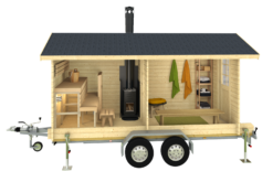 Kärrysaunat on valmistettu korkealaatuisesta kuusipuusta, ja pakettiin kuuluvat leppälauteet, puukiuas ja Suomessa valmistettu korkealaatuinen ja sulkupellillinen savupiippu, jossa on vesisäiliö.